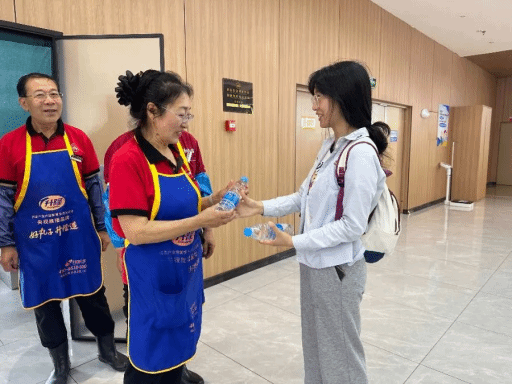 在校园主干道、操场周边和教学楼附近,志愿者们主动上前,将饮用水双手递给正在清扫落叶、清理杂物的后勤工作人员,真诚问候。后勤工作人员们既惊喜又欣慰,连声道谢,温情在简单的对话中流淌。